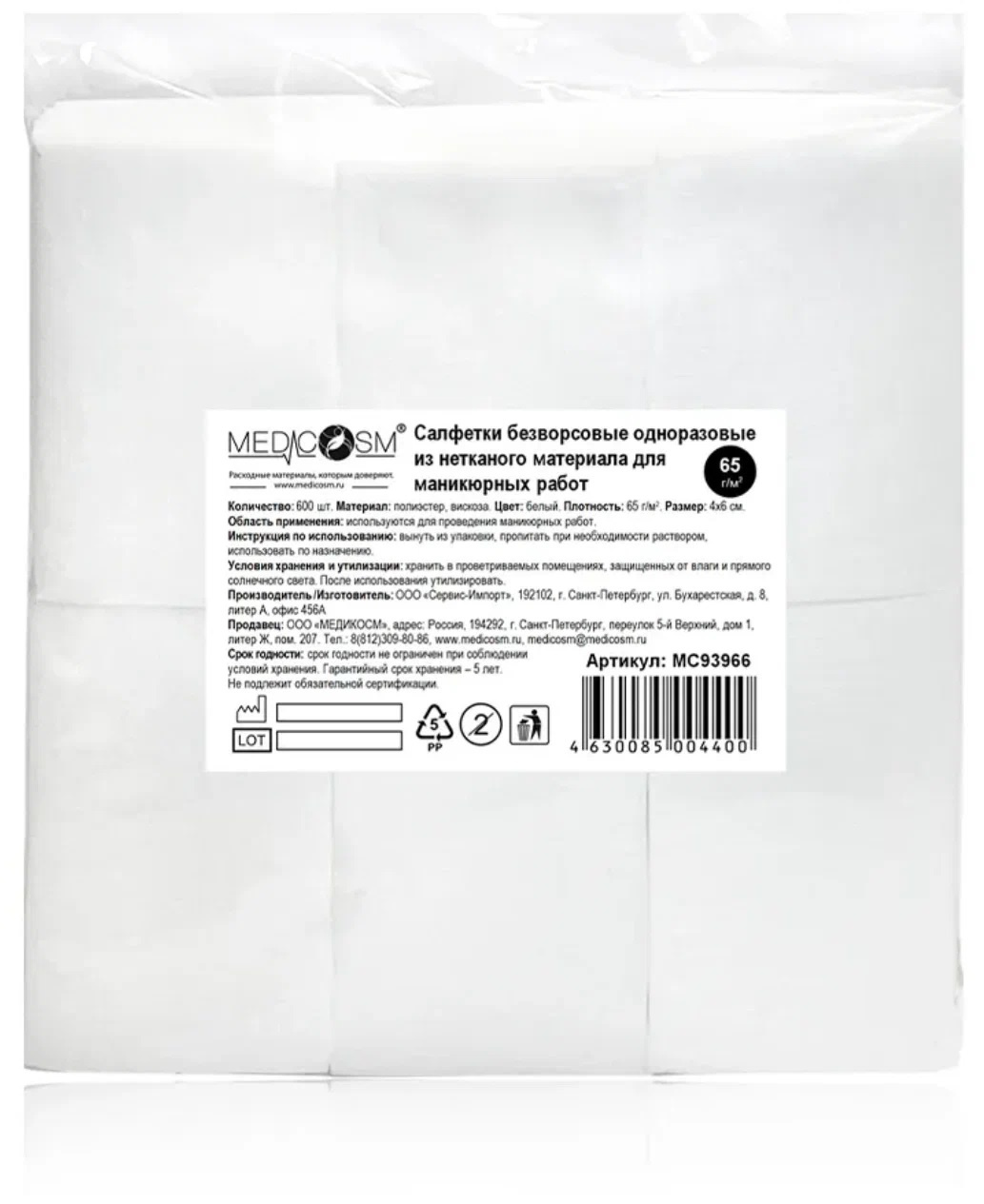 Салфетки безворсовые для маникюра 4х6 см MEDICOSM, 600 шт/упк