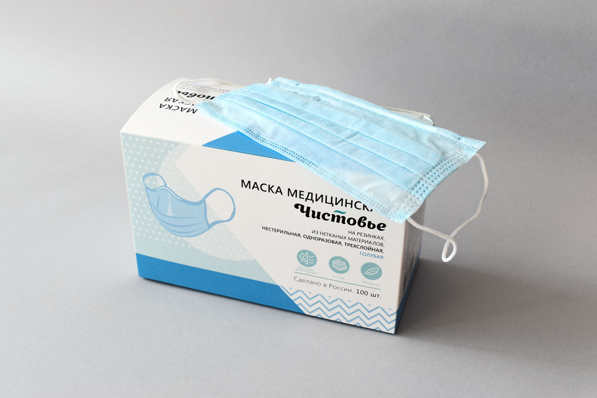 Маска 3-х слойная на резинке ГОЛУБАЯ Чистовье, 100 шт/упк