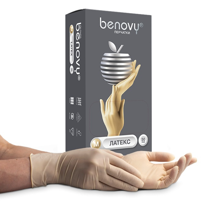 Перчатки латексные БЕЖЕВЫЕ BENOVY размер L, 50 пар/упк