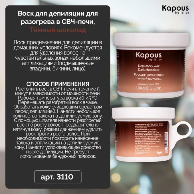 Воск для депиляции для разогрева в СВЧ-печи Темный шоколад KAPOUS, 100 гр